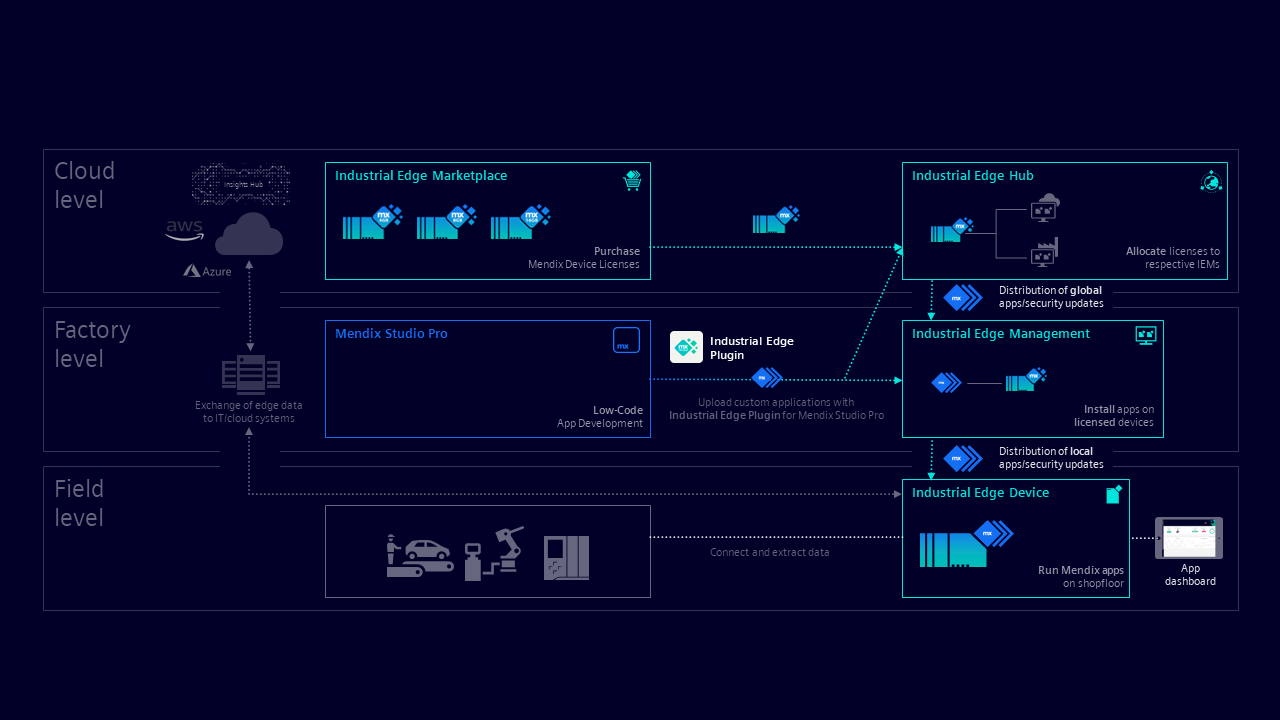 The overall Industrial Edge and hence the Mendix on Edge architecture is grouped into 3 main layers which represent a standard customer setup: