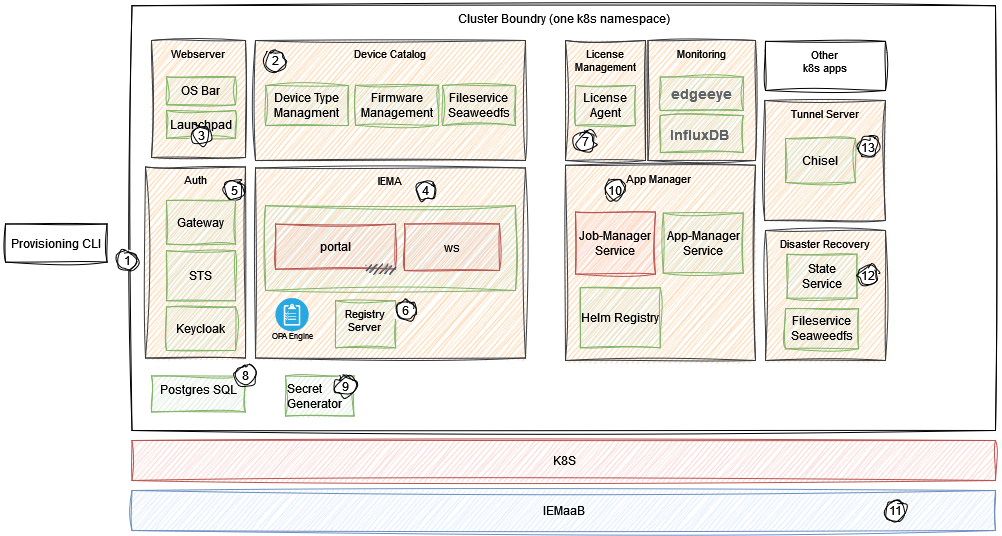 The Industrial Edge Management App (IEMA) is the main component that manages the IED application and devices. It is deployed as a K8s stateful set.