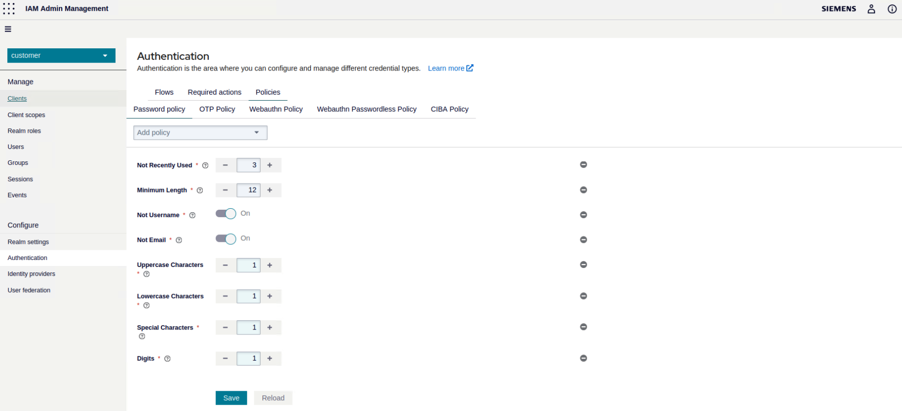 Savewhen you are done.After saving the password policy, Keycloak enforces the policy for new users. For existing users, Keycloak sets an update password action to ensure existing users change their password the next time they log in.